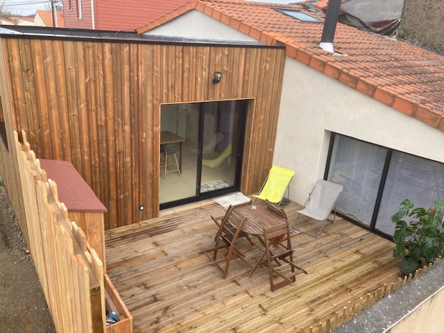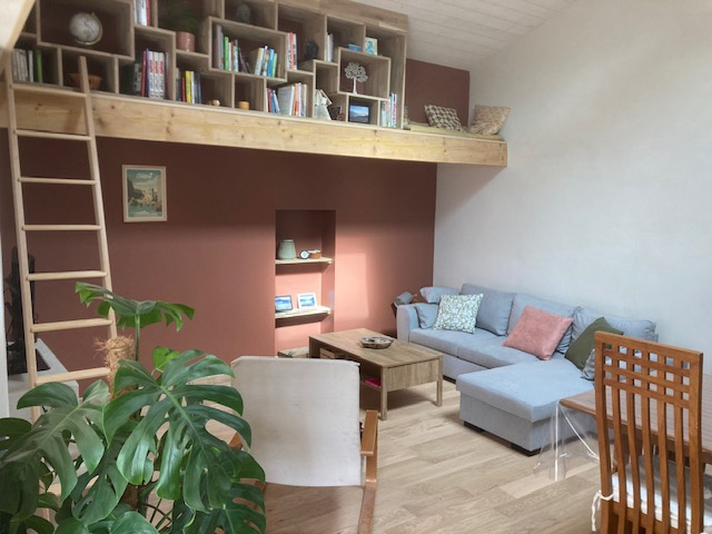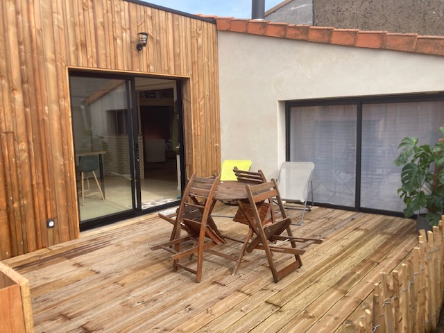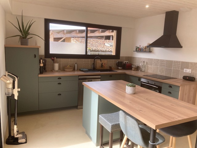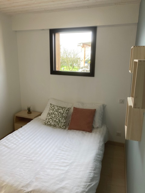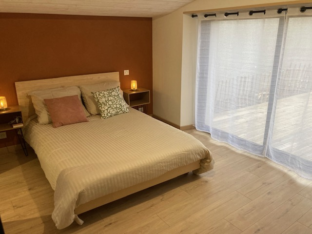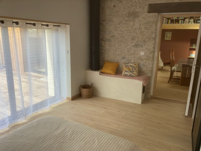 Une cuisine entièrement équipée (réfrigérateur, plaque induction, lave-vaisselle, hotte, micro-onde...) avec un accès direct de plain-pied sur une terrasse bois Un salon-séjour avec canapé convertible, TV, bibliothèque, table et chaises, Une chambre parentale avec dressing et accès sur la salle d'eau (meuble simple vasque, douche, lave-linge) donnant sur la terrasse bois, Une 2è chambre avec lit 2 places et rangement, Ouvertures double vitrage avec volets électriques. Chauffage écologique au poêle à bois. DPE C. Stationnement privatif,