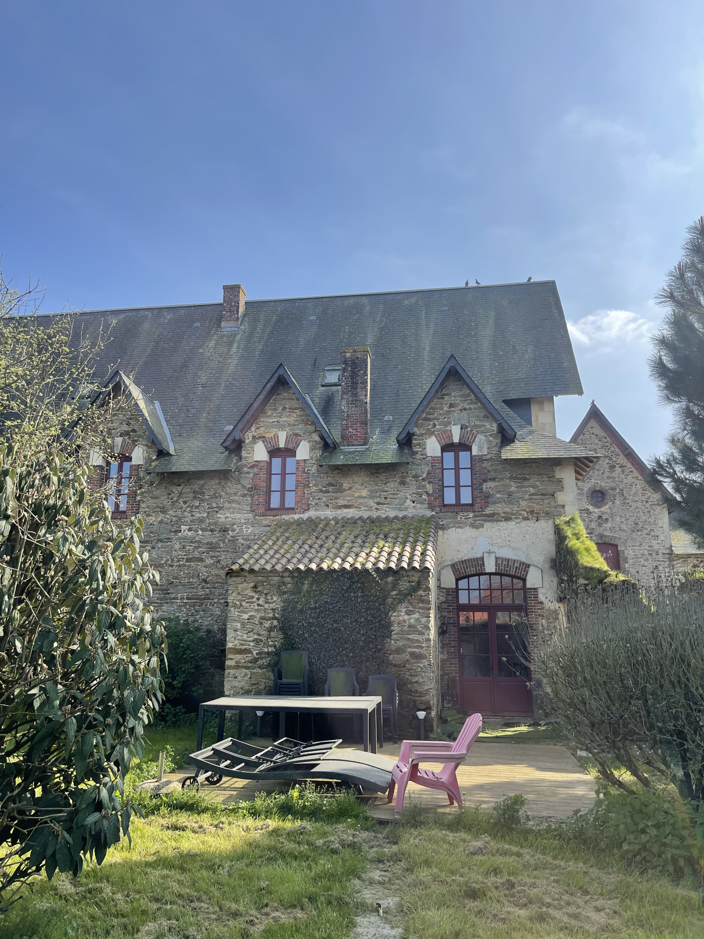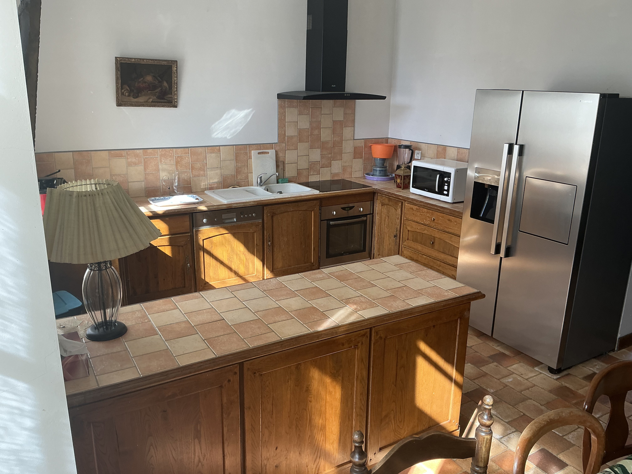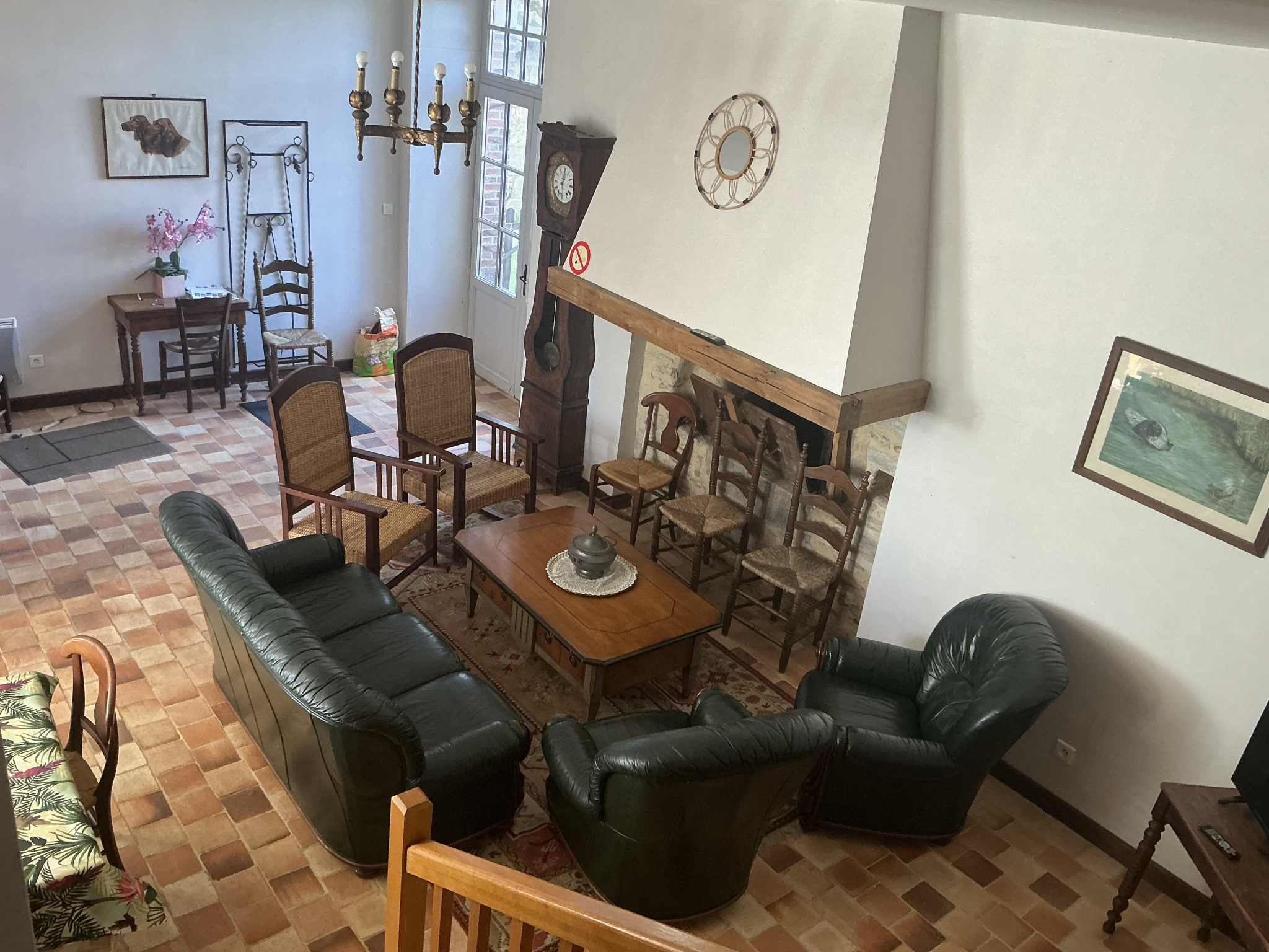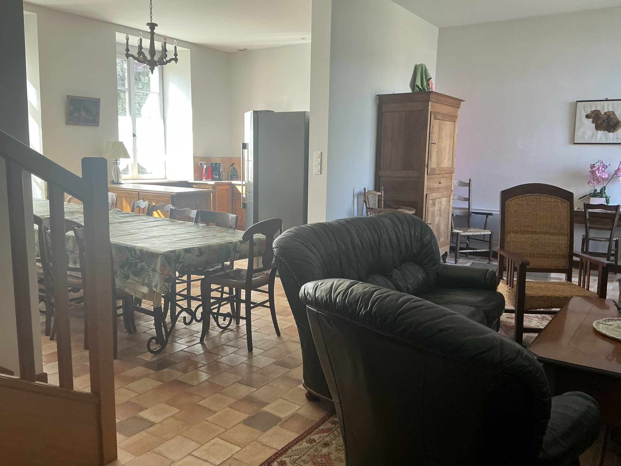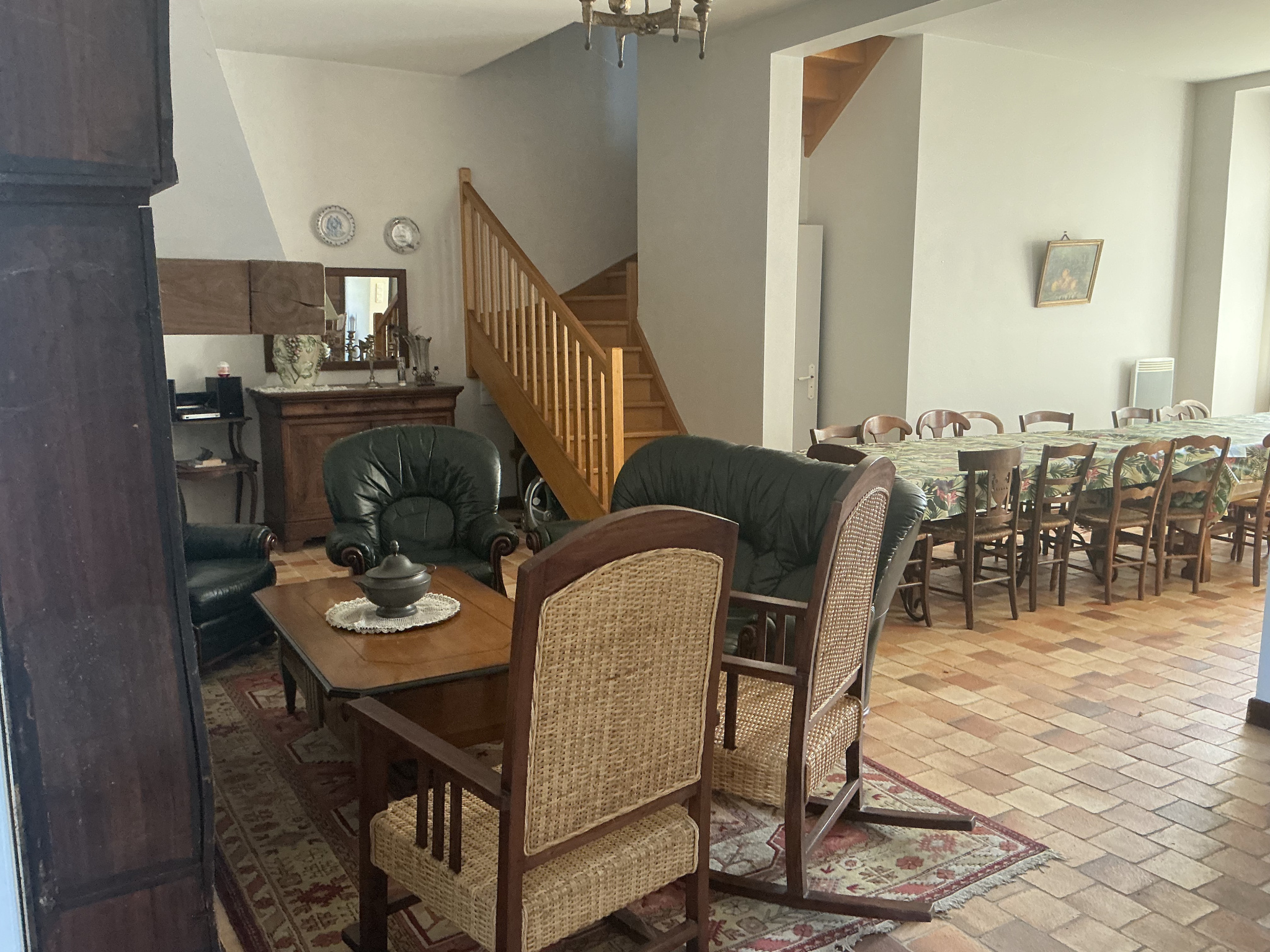 Une autre entrée est possible par un élégant hall central en tomettes, avec un bel escalier qui confère à l'ensemble une atmosphère chaleureuse et authentique.