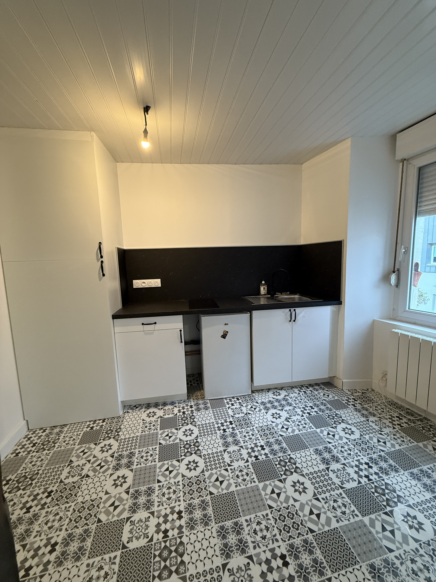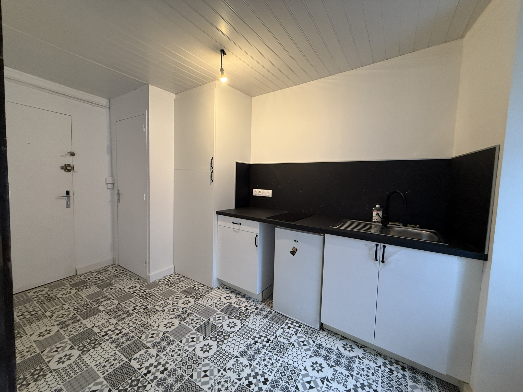 D'une cuisine aménagée avec plaque de cuisson et réfrigérateur top + emplacement pour machine à laver,