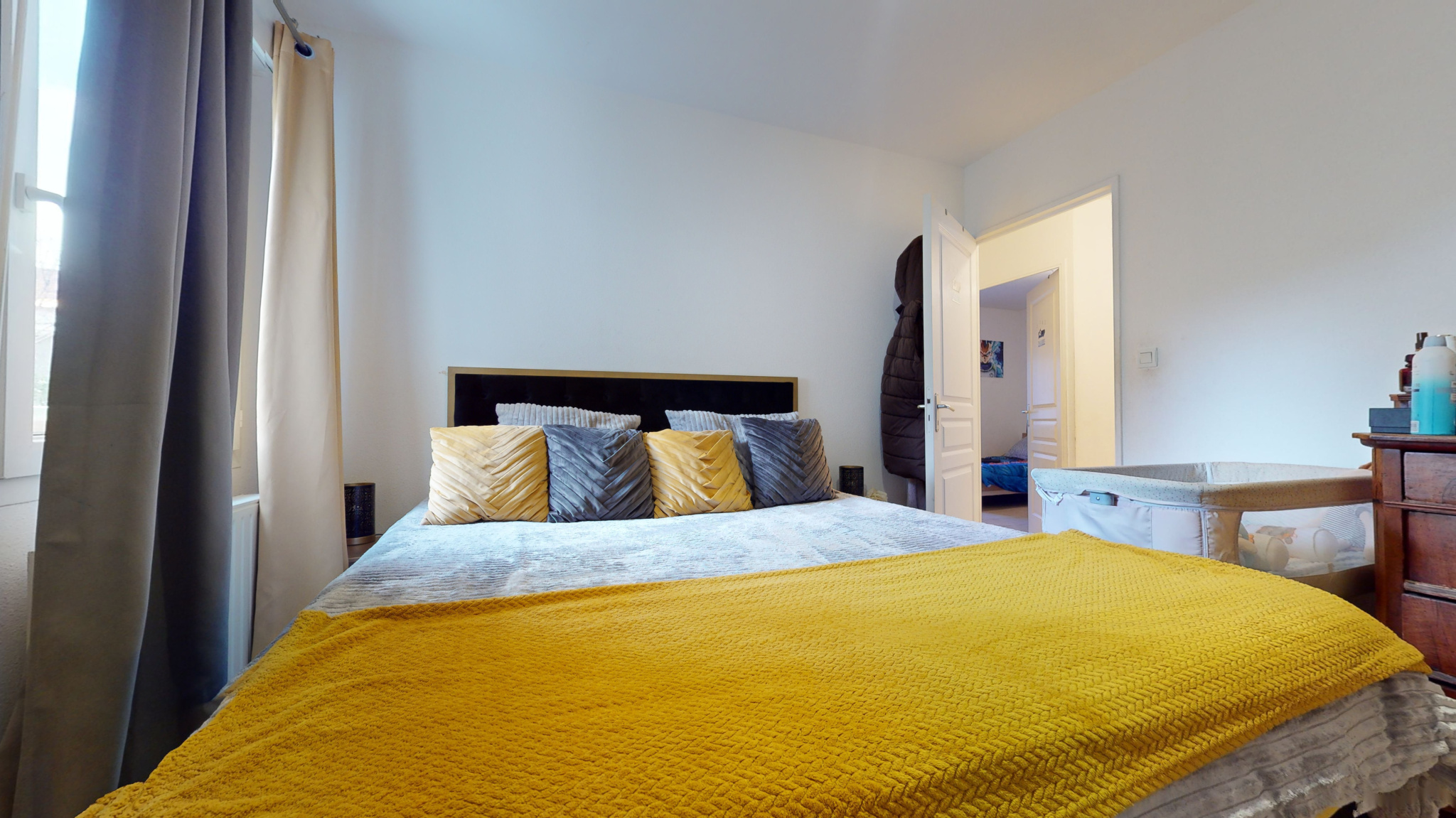 La configuration intérieure comprend trois chambres. La première chambre de 11,22m2 offre un vaste placard double, la deuxième de 10,79m2 propose un placard intégré, tandis que la troisième de 10,42m2 dispose d'un placard double et offre une vue sur une partie du jardin.