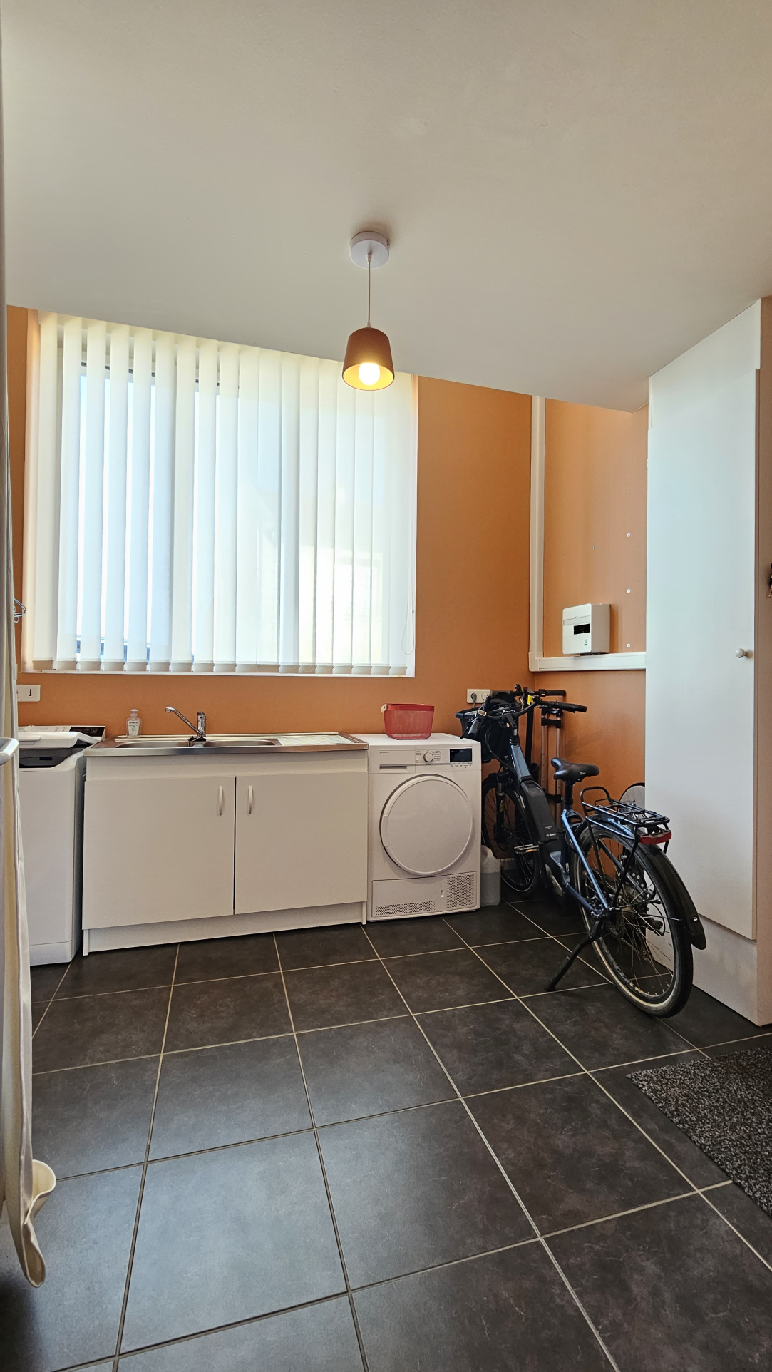 Le rez-de-chaussée propose également une lingerie spacieuse et fonctionnelle, une chambre avec placard intégré, une salle d'eau avec douche, sèche-serviettes et meuble vasque, ainsi qu'un WC indépendant.