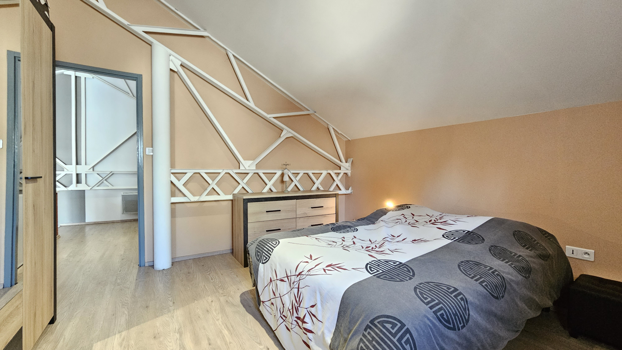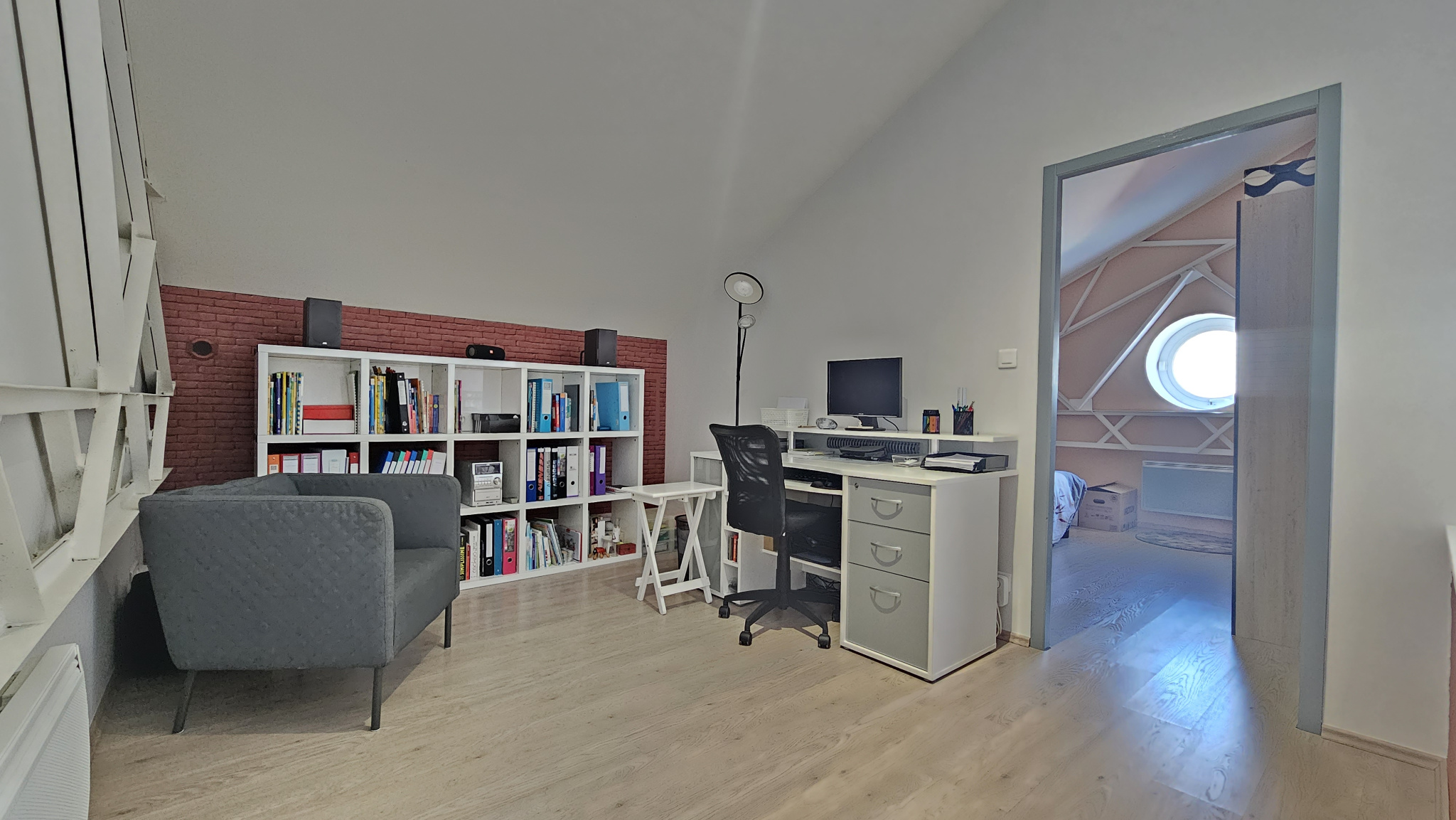 À l'étage, une agréable mezzanine d'environ 11 m2 surplombe la pièce principale. Elle offre un espace idéal pour un bureau, un coin lecture ou une salle de jeux. Vous y trouverez également une seconde chambre spacieuse, parfaite pour accueillir famille ou invités.