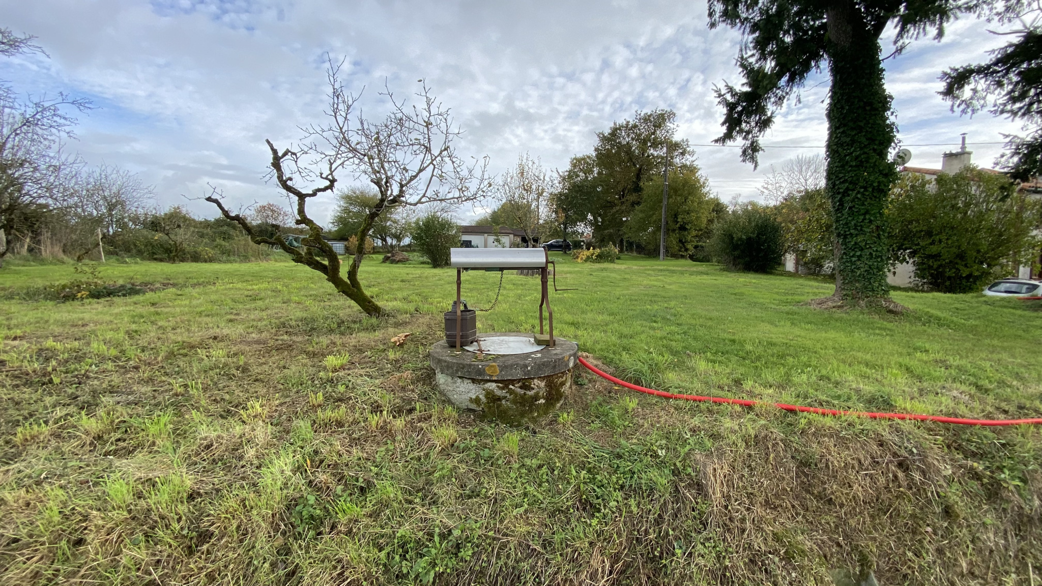Maison atypique et au calme, avec une dépendance composée de deux garages, ainsi qu'un terrain de 2 040 m2 agrémenté d'arbres fruitiers et d'un puits.