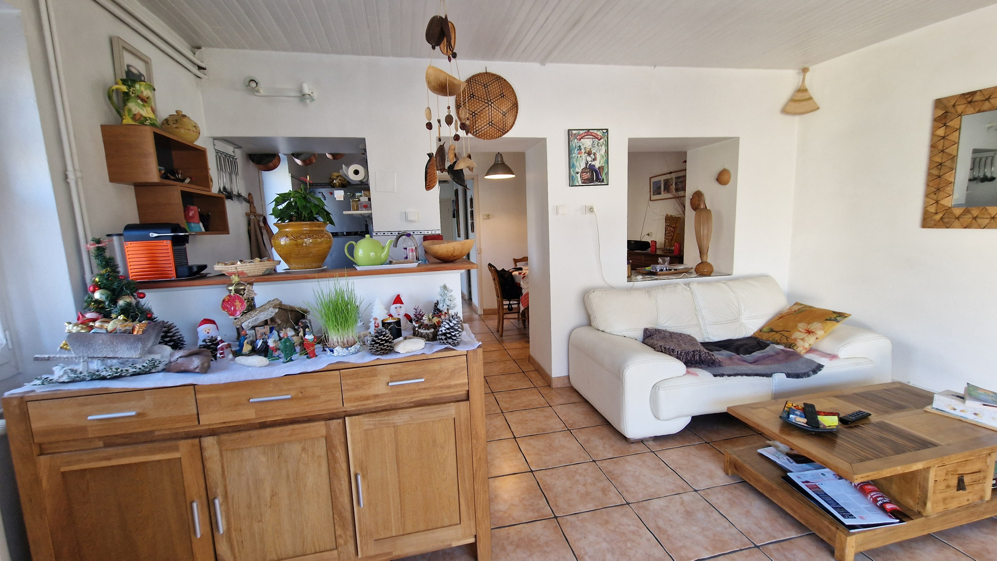 Belle pièce de vie regroupant cuisine aménagée, salle à manger et coin salon, avec accès direct sur la terrasse