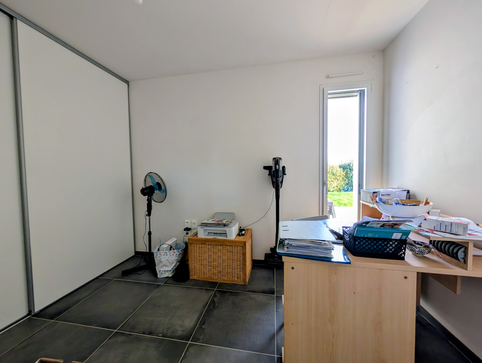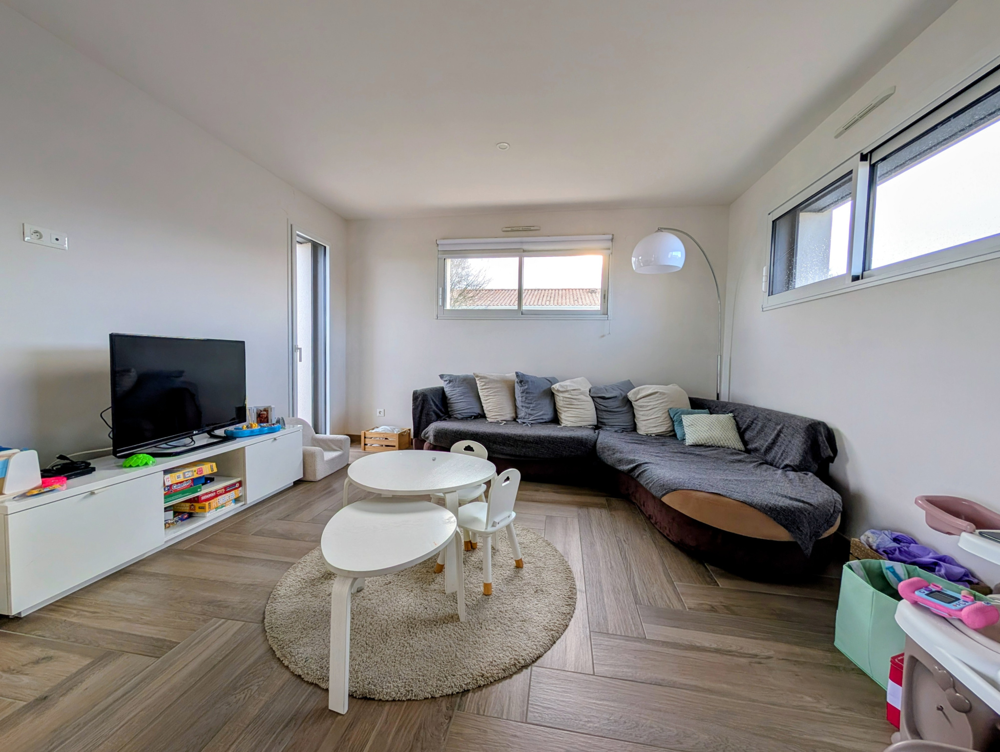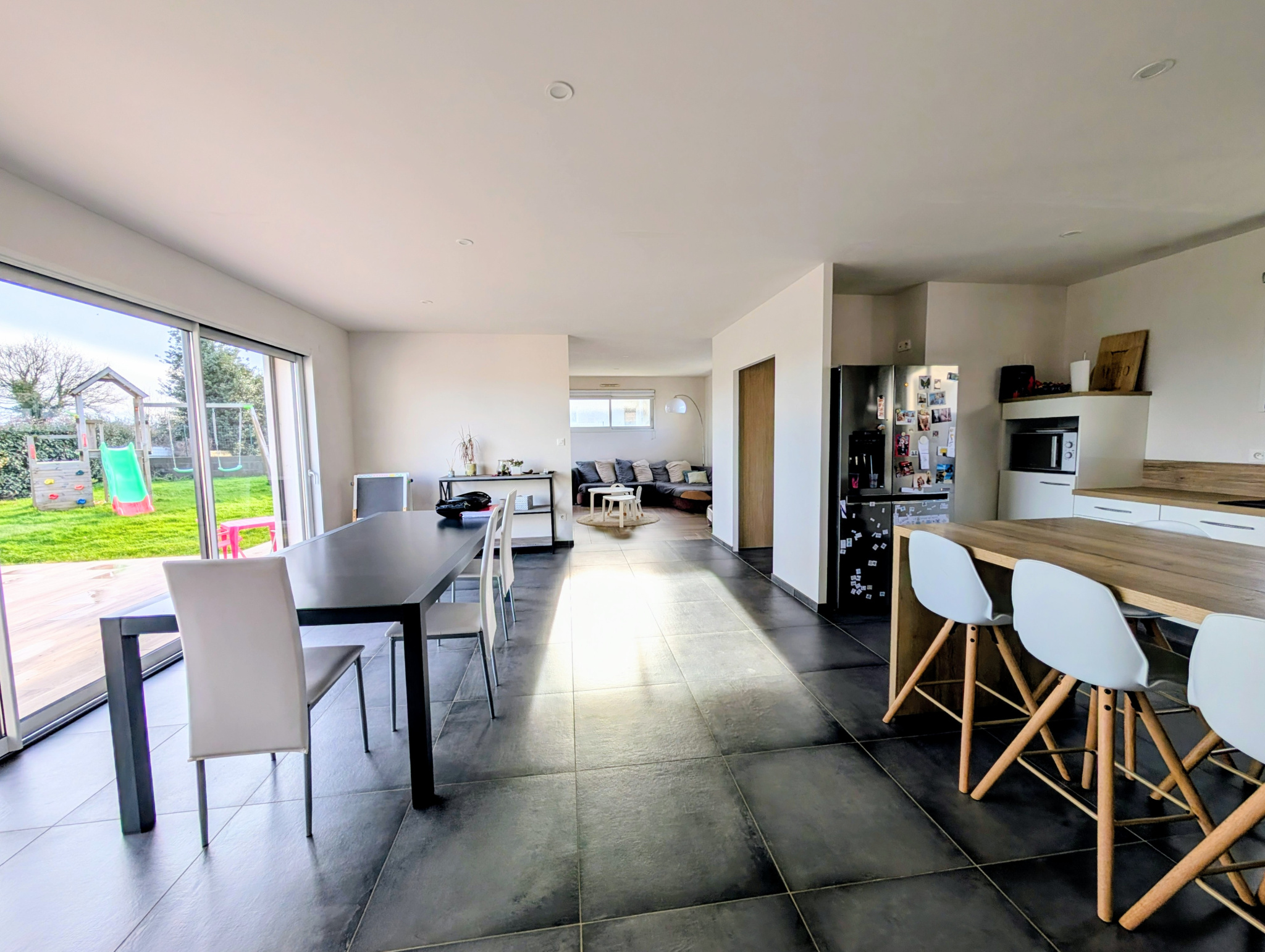 La pièce de vie, véritable coeur de la maison, déploie un volume généreux de plus de 50 m2 où chaque détail a été pensé pour le confort. Baigné de lumière naturelle grâce à une majestueuse baie vitrée à trois vantaux exposée plein sud, cet espace s'ouvre largement sur une terrasse de 43 m2, créant une transition fluide vers le jardin. La cuisine, signature d'un artisan menuisier, allie esthétisme et fonctionnalité avec un mobilier sur mesure et un équipement complet. En retrait, un coin salon cosy invite à la détente, tandis que la circulation se prolonge naturellement vers un espace fonctionnel comprenant un WC indépendant avec lave-mains, un bureau idéal pour le télétravail et une lingerie pratique.