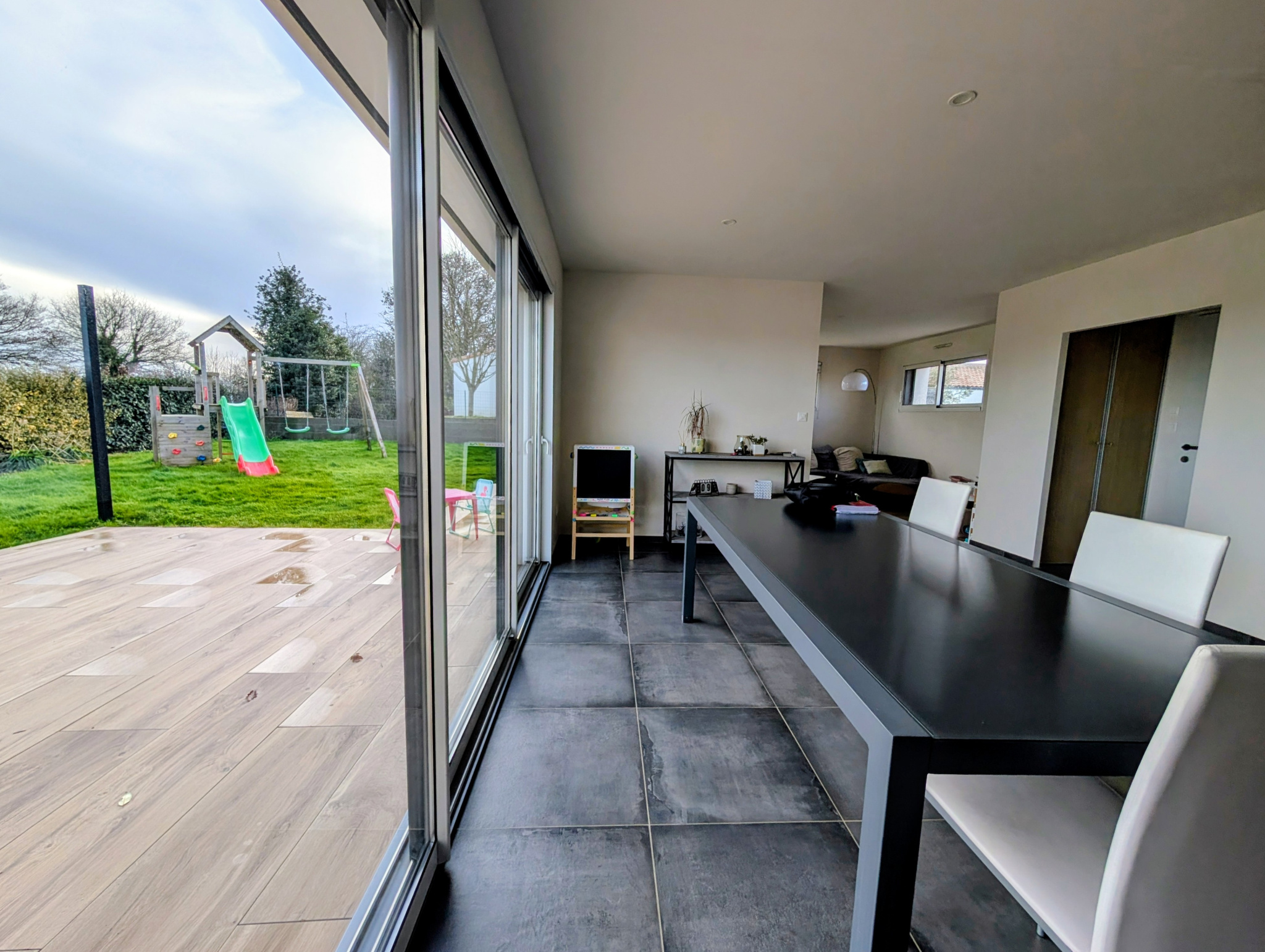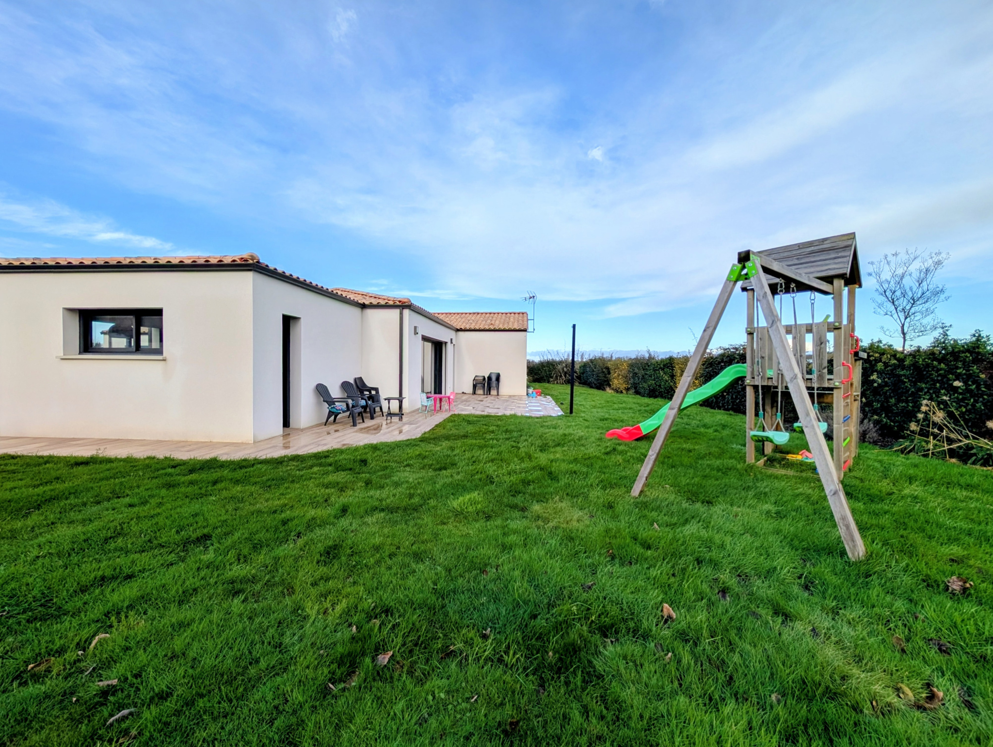 Le terrain de plus de 900m2, entoure la maison dans un calme olympien. La terrasse de 43m2 est l'endroit idéal pour profiter des beaux jours en tout intimité.