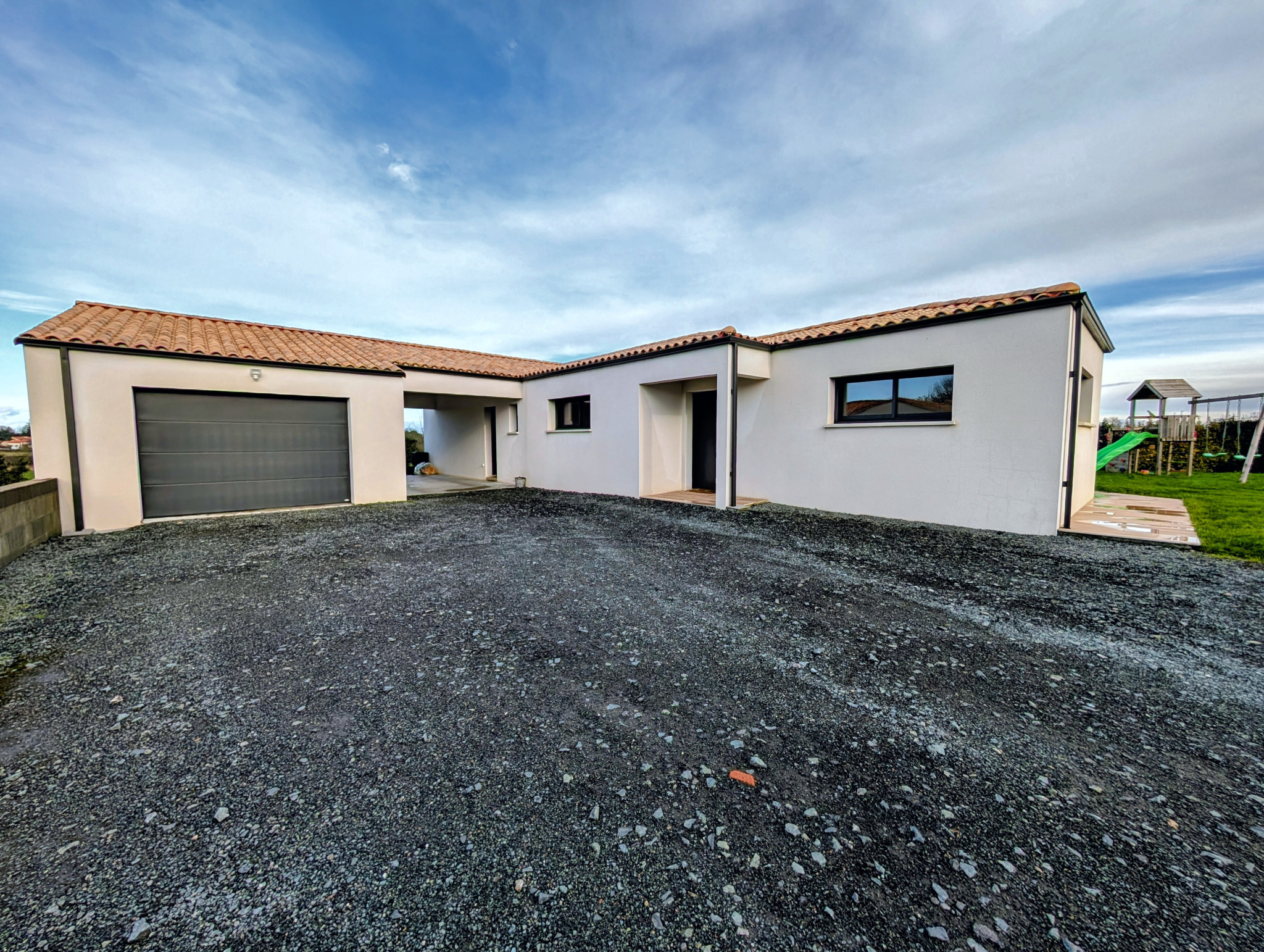 Chauffage au sol intégral par pompe à chaleur air/eau. Ouvertures en aluminium, volets roulants électriques. Assainissement conforme.