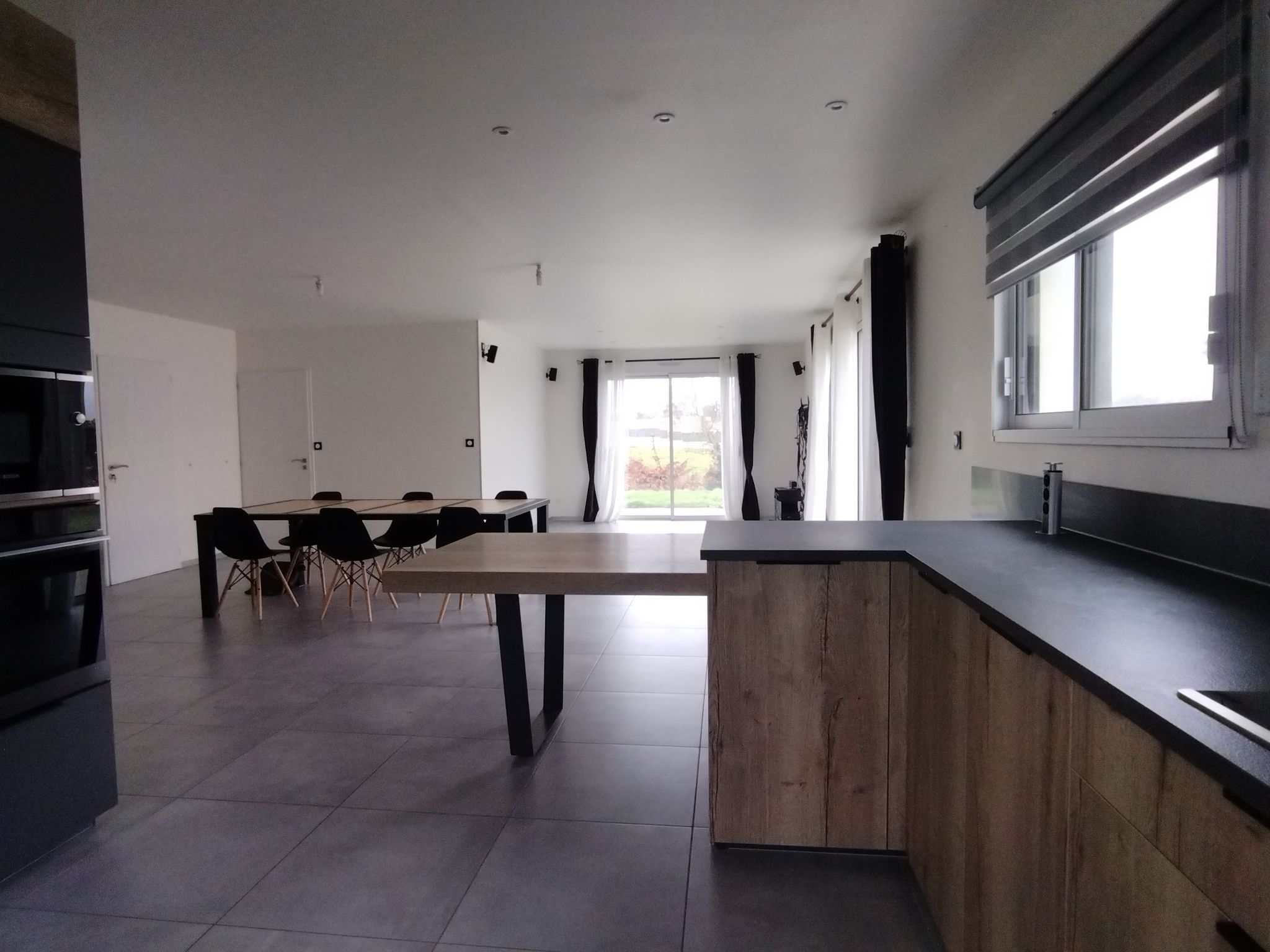 Elle comprend une entrée avec placard, une spacieuse et lumineuse pièce de vie de plus de 60 m2 avec vue dégagée sur espace vert communal. Dans cette pièce, on retrouve un espace salon, un espace salle à manger et une grande cuisine meublée et équipée comprenant un four, un four micro onde, un lave vaisselle, une plaque, une hotte et une cave à vin.