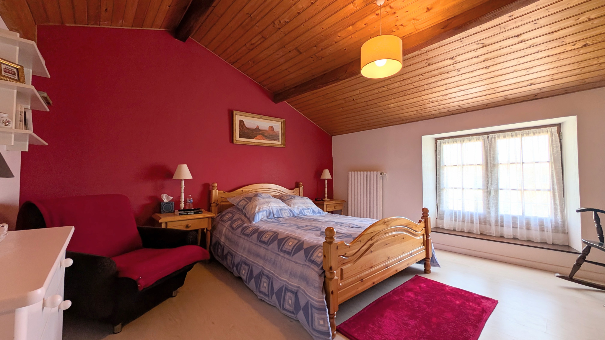 L'escalier en bois d'origine nous conduit à l'étage, où nous retrouvons 2 autres chambres dont une équipée de placards intégrés, une salle d'eau et un bureau.