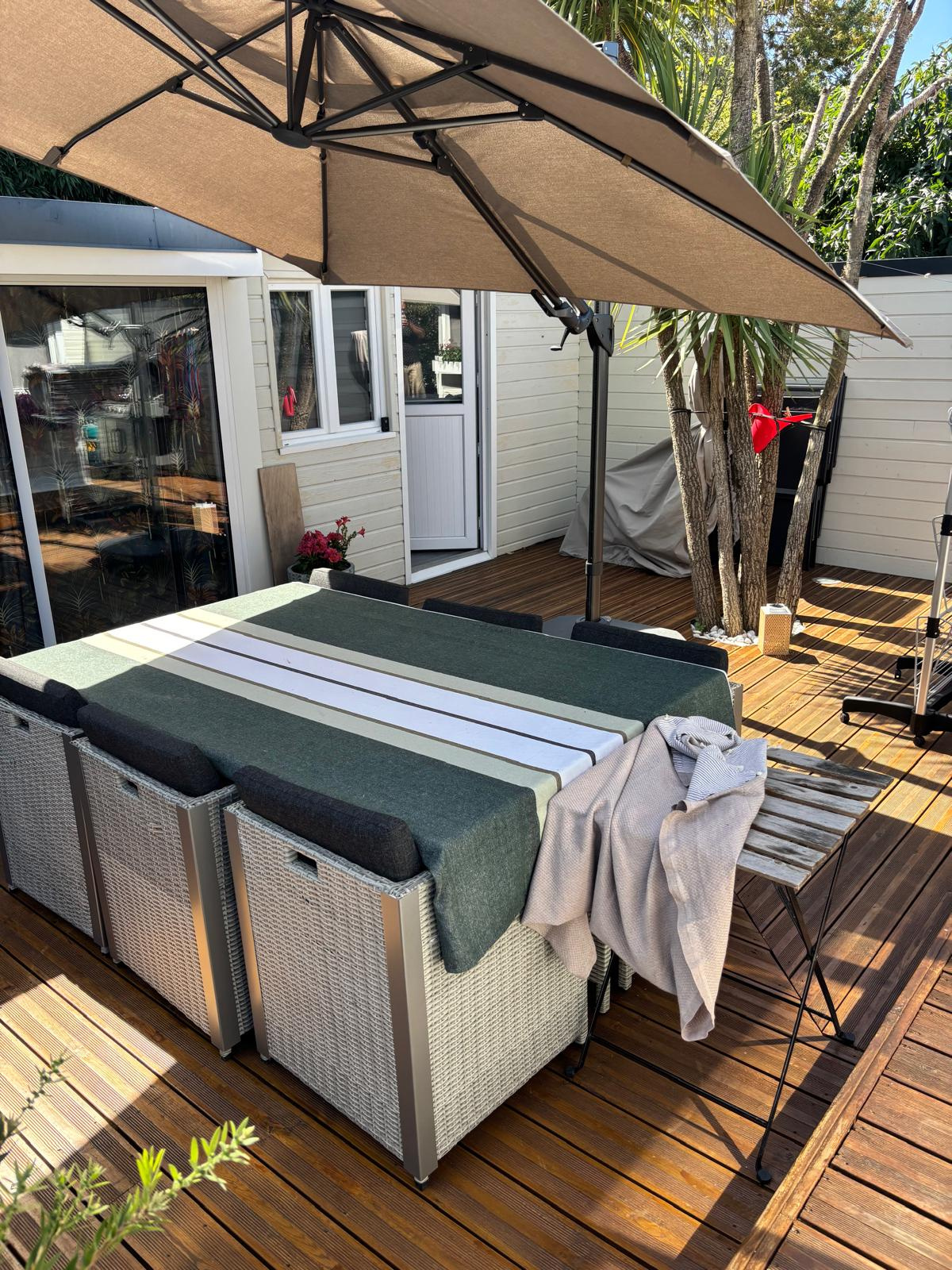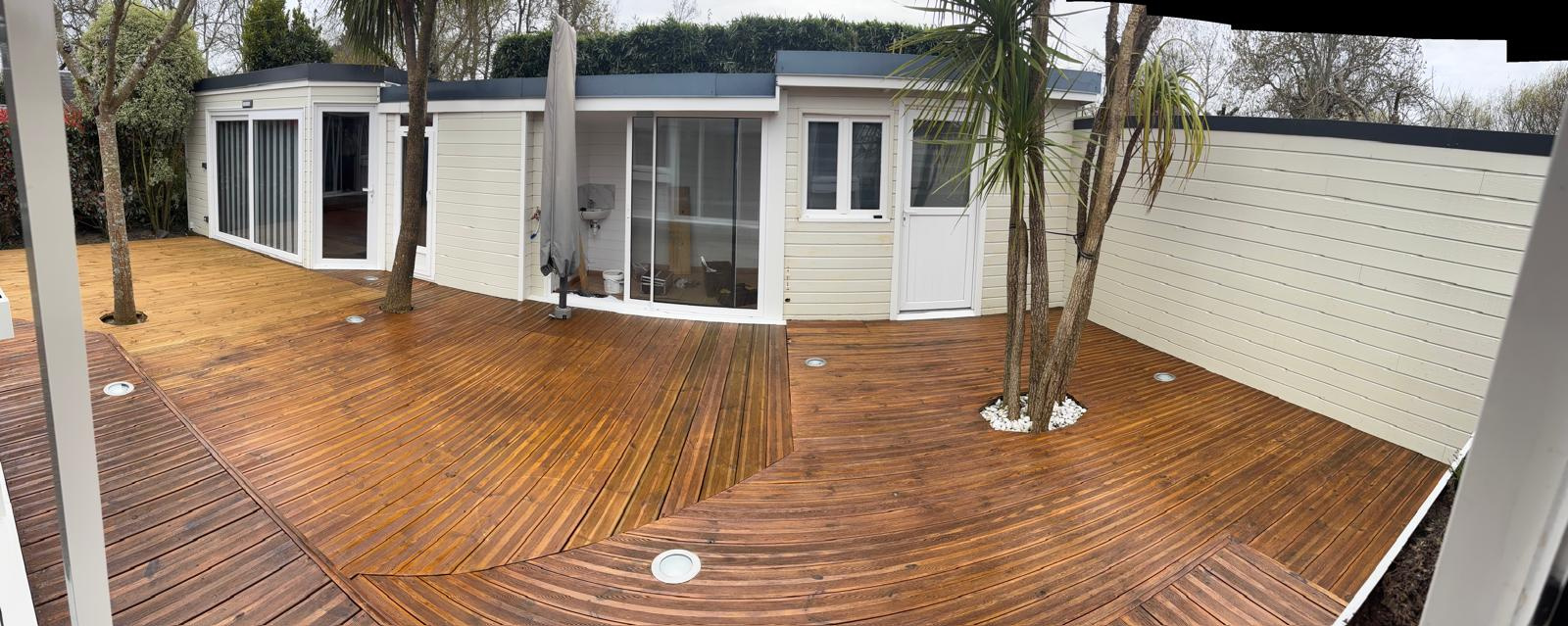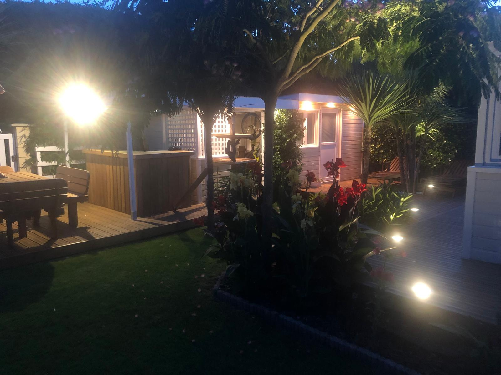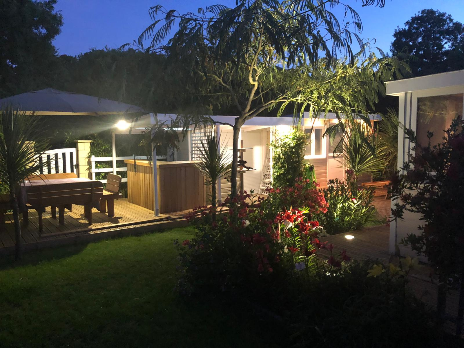 En extérieur, une grande terrasse équipée de grands parasols et d'éclairages au sol ainsi que 2 cabanons de jardin.