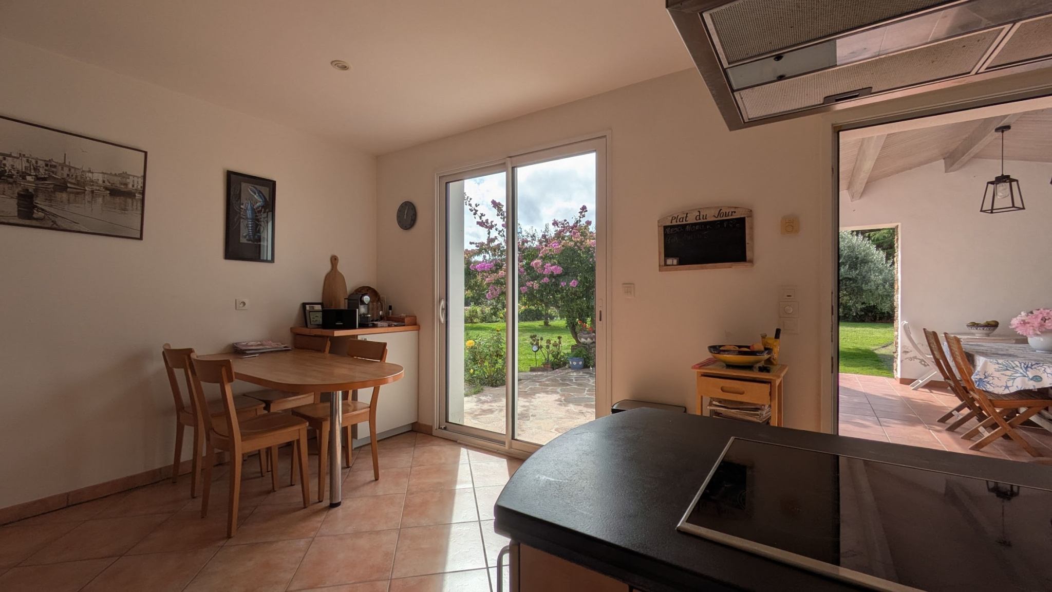 La maison, lumineuse et fonctionnelle, se compose d'un grand séjour avec cheminée et cuisine ouverte donnant directement sur une terrasse avec barbecue, parfaite pour les repas d'été.